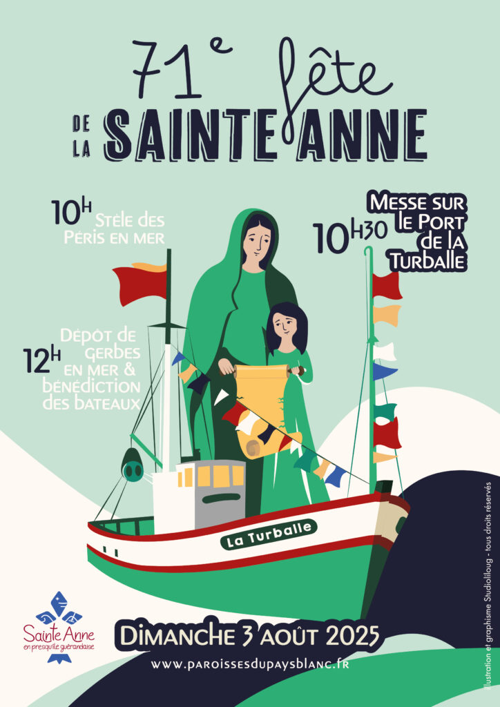Depuis janvier 2025, sainte Anne est devenue la sainte patronne de l’ensemble de notre paroisse. Voilà pourquoi nous vous invitons à venir nous rejoindre le 3 août pour la célébrer sur l’esplanade de la criée du port de La Turballe.